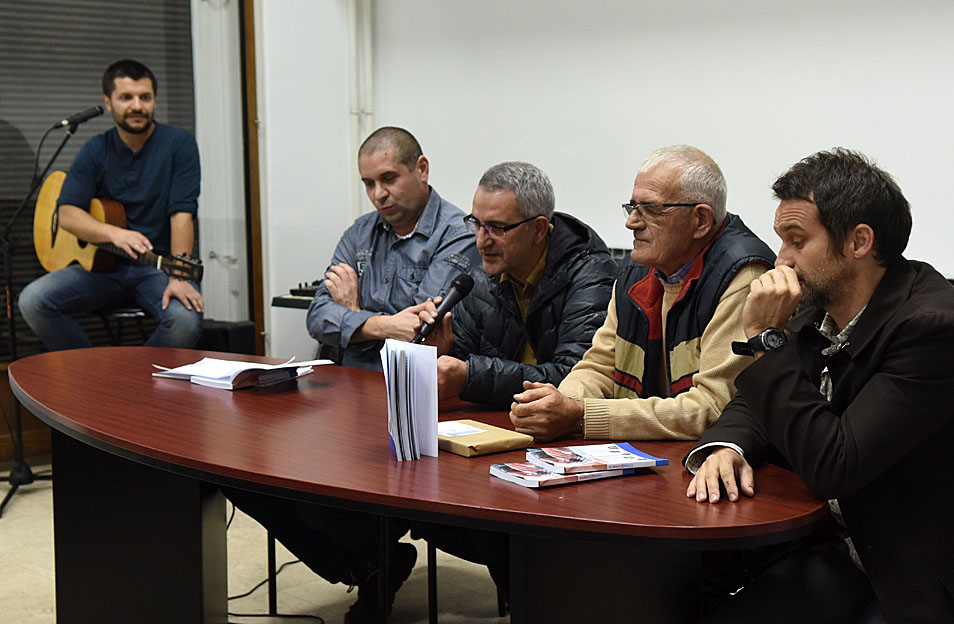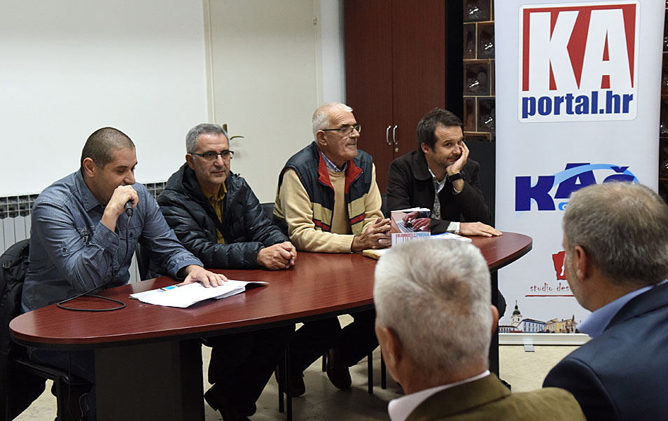 Vedran Gvožđak, Marijan Bakić, Lovro Zaplatić i Tihomir Ivka. Promocija zbirke kolumni povodom pete godine Kaportala i 40 godina novinarskog rada Marijana Bakića u Knjižnici za mlade u Karlovcu 10. studenog 2015. godine. Foto: Robert Fajt/Kaportal