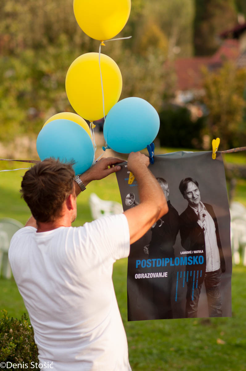 Voditelj Festivala DOK – festivala za ljude dobre volje – Nikola Vukmanić postavlja plakat za predstavu Vilija Matule “Postdiplomsko obrazovanje” koja se igrala 10. 9. 2016. godine u Kamanju