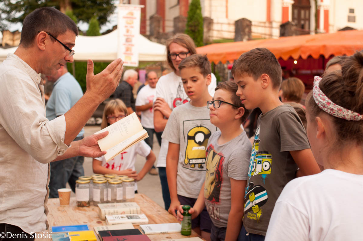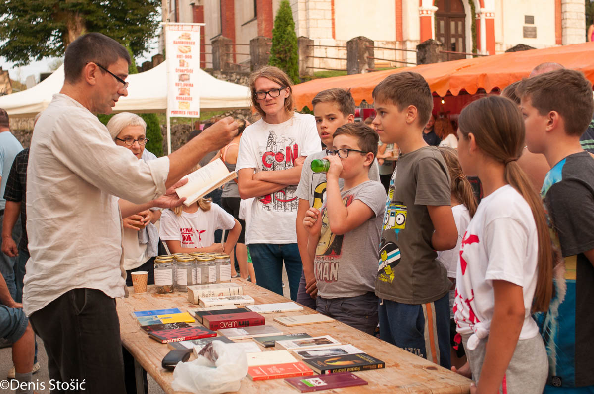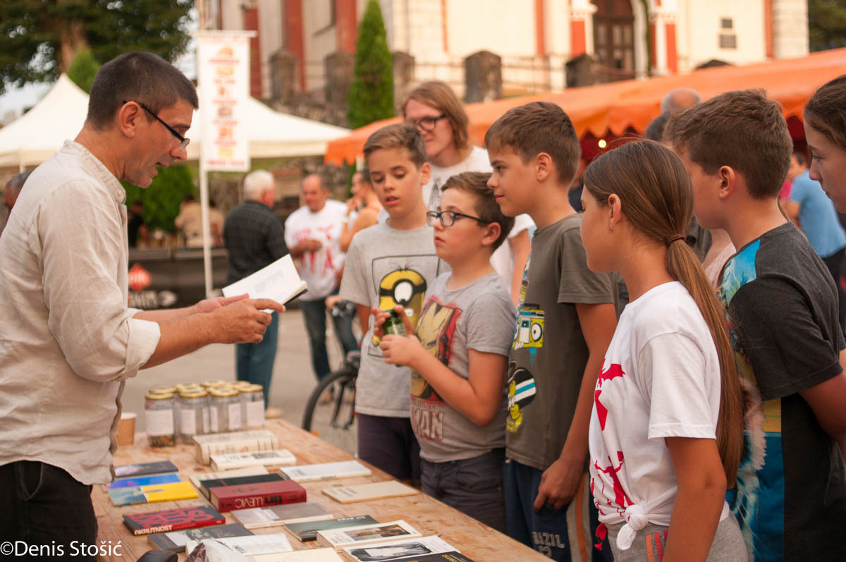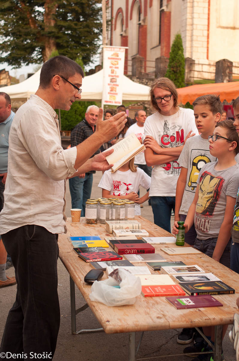 Konceptualni umjetnik Siniša Labrović održao je u Kamanju 10. 9. 2016. godine performans “Rasprodaja poezije do isteka zaliha”. Foto: Denis Stošić
