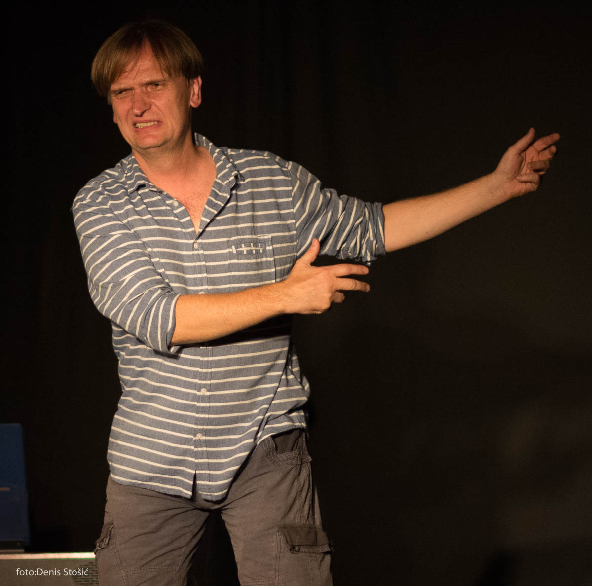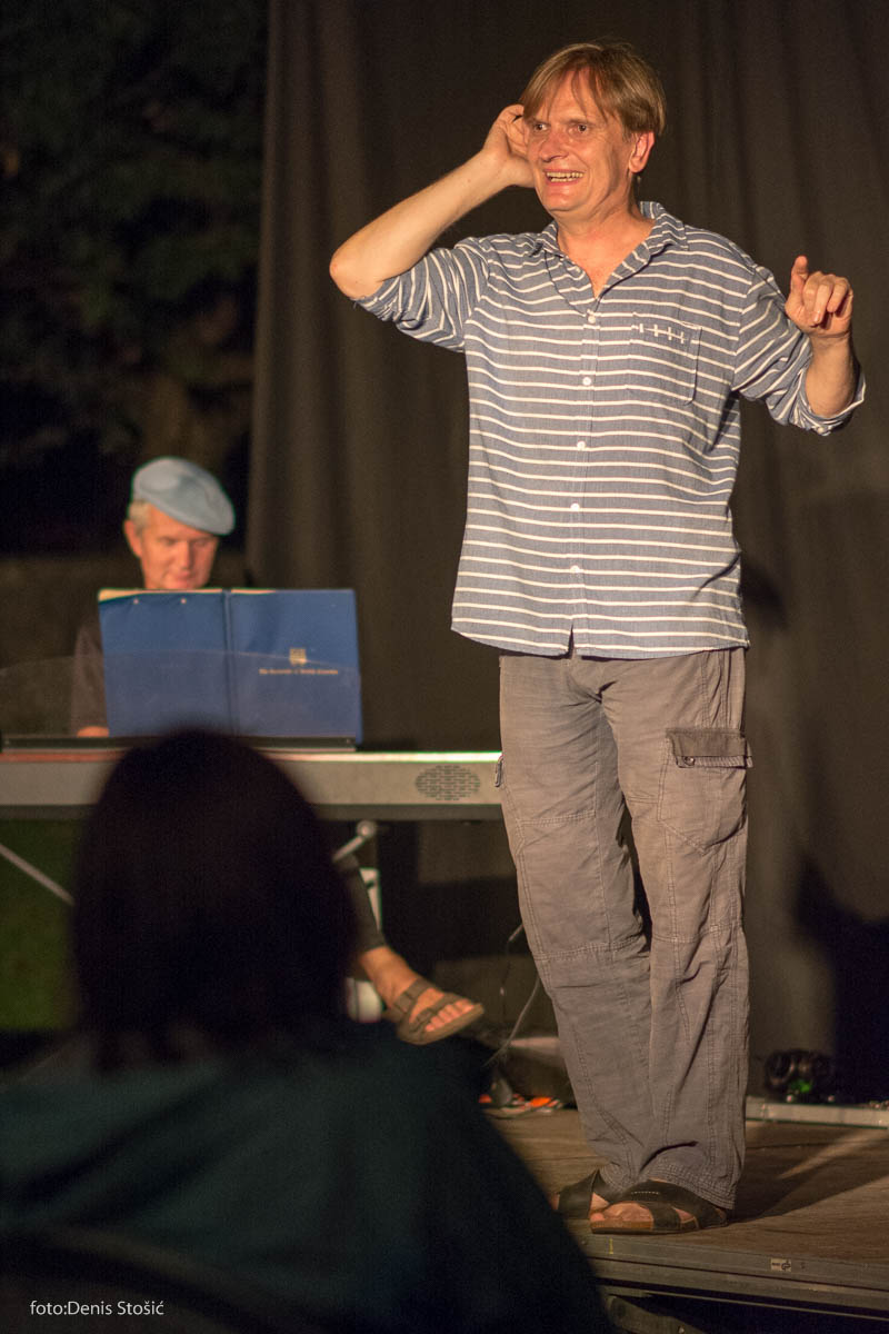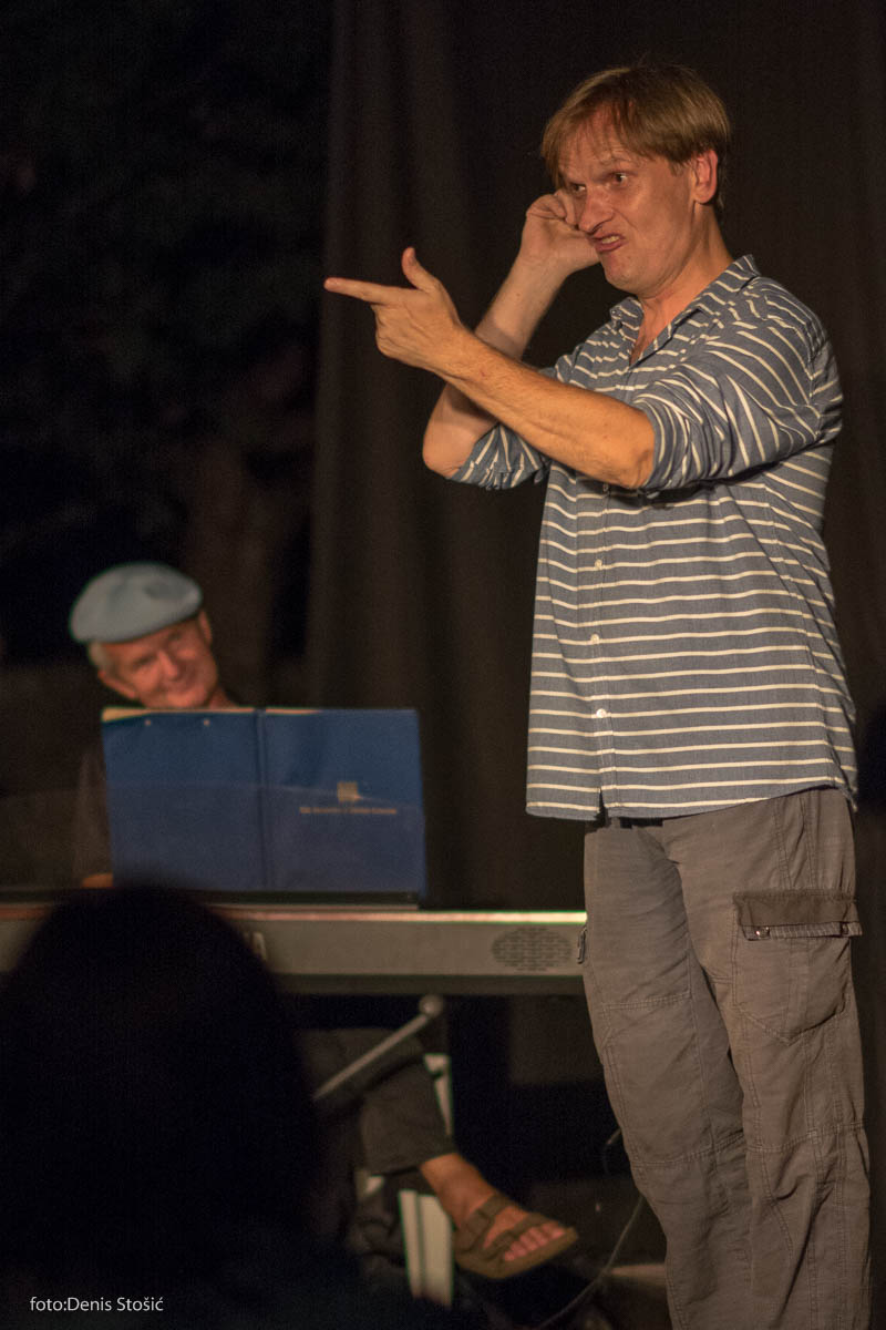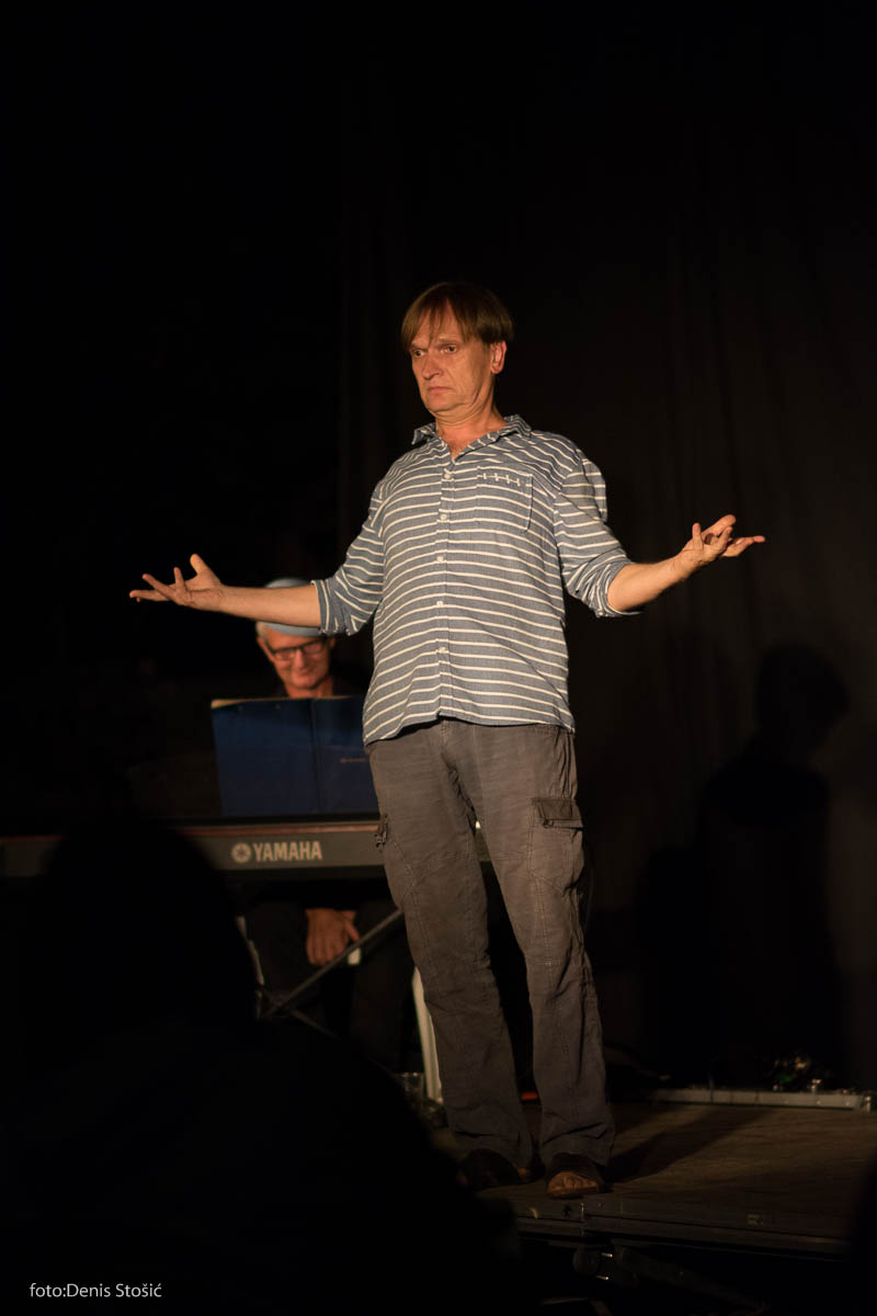 Glumac Vili Matula odigrao je u Kamanju 10. 9. 2016. u suradnji s Igorom Pavlicom, a u sklopu Festivala DOK – festivala za ljude dobre volje – predstavu “Postdiplomsko obrazovanje”. Foto: Denis Stošić