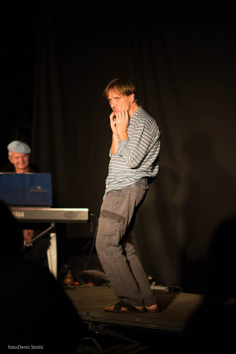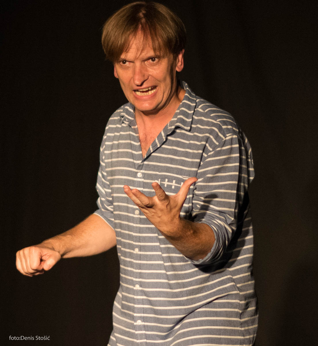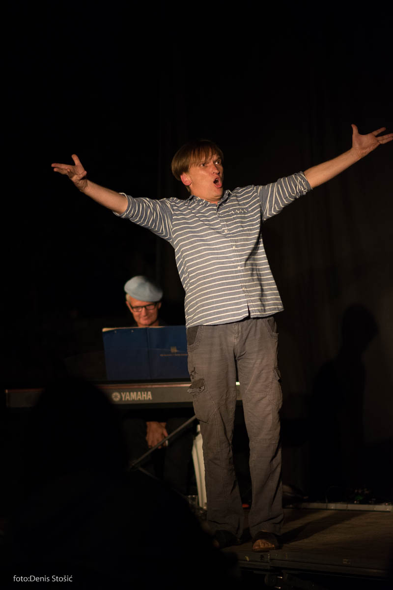 Glumac Vili Matula odigrao je u Kamanju 10. 9. 2016. u suradnji s Igorom Pavlicom, a u sklopu Festivala DOK – festivala za ljude dobre volje – predstavu “Postdiplomsko obrazovanje”. Foto: Denis Stošić